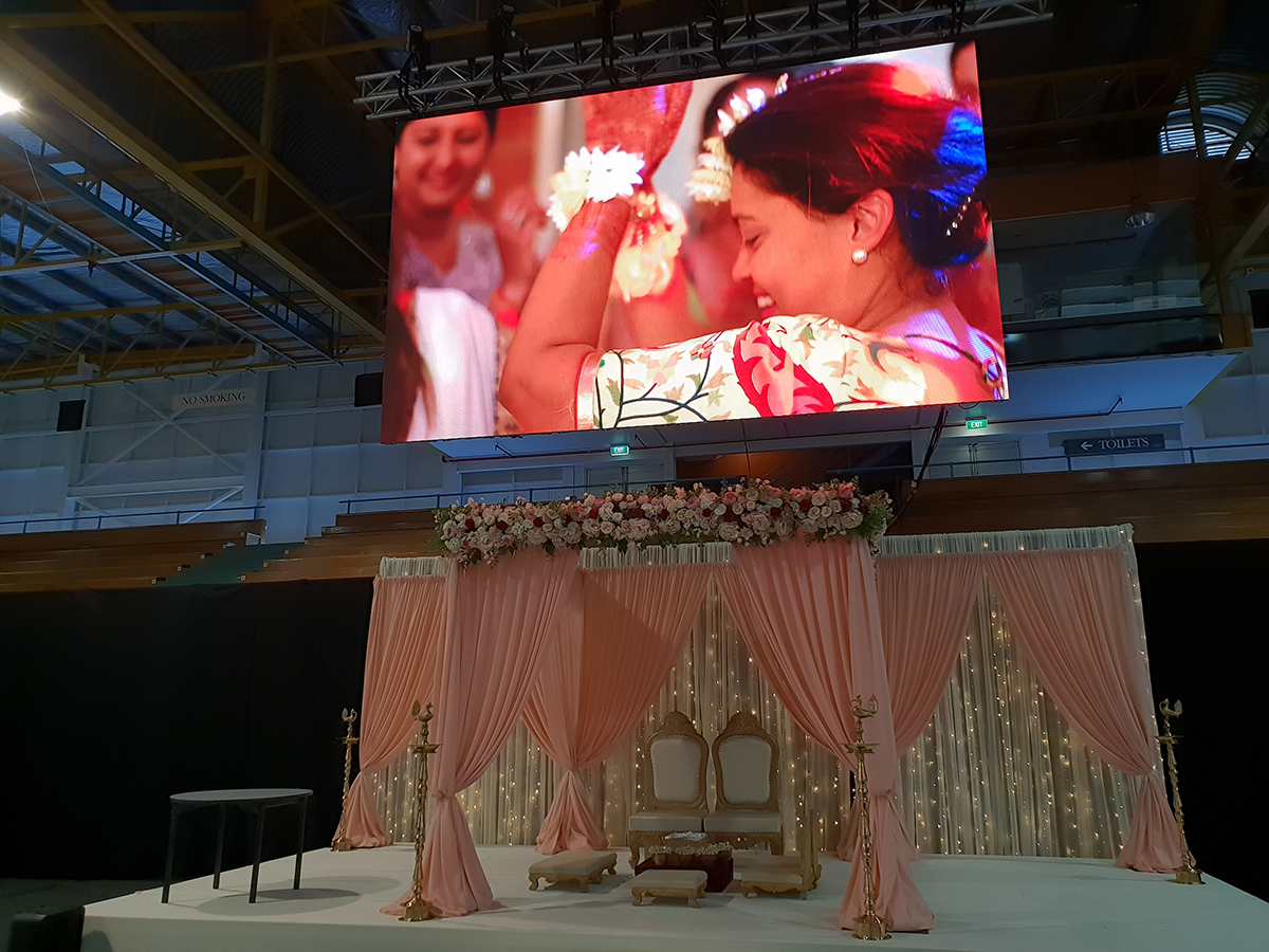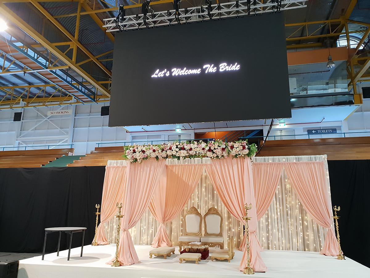 It can also be used as a stage backdrop to display any image or video. This opens up the possibility of customizing the look of your main stage with unlimited images or videos you can use as a background. Imagine the backdrop of your Mandap being the Tajmahal, Sheikh Zayed Grand Mosque, Eiffel Tower, Mount Everest, Niagara Falls, Sky Tower, Mt Ruapehu or any place you wish you could get married at. We can bring the world to your wedding venue.